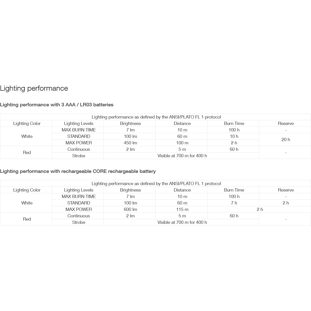 • drie witte lichtniveaus: MAX BURN TIME (maximale brandduur), STANDARD (optimale verhouding lichtsterkte/duur) en MAX POWER (maximale lichtsterkte),